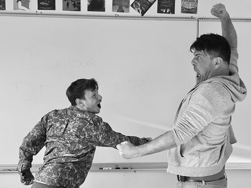 Le jour de la première séance avec les élèves, les professeurs se sont rendus complices des comédiens : ces derniers sont arrivés dans les classes sans que les élèves ne soient prévenus. Effet de surprise garanti ! Les comédiens ont présenté un spectacle d’une vingtaine de minutes abordant de façon à la fois comique et engagé le fil rouge de la résidence : l’émotion de la colère. Puis, une discussion s’est amorcée entre les élèves et les comédiens. Des sujets tels que l’évocation des grandes luttes des humains, nos quatre émotions fondamentales ou encore le parcours des comédiens ont été abordés dans la bonne humeur. Flora Diguet, metteuse en scène et comédienne, explique : « Cela nous a permis de rentrer dans la thématique de la colère par l’action plutôt que par les mots ».
