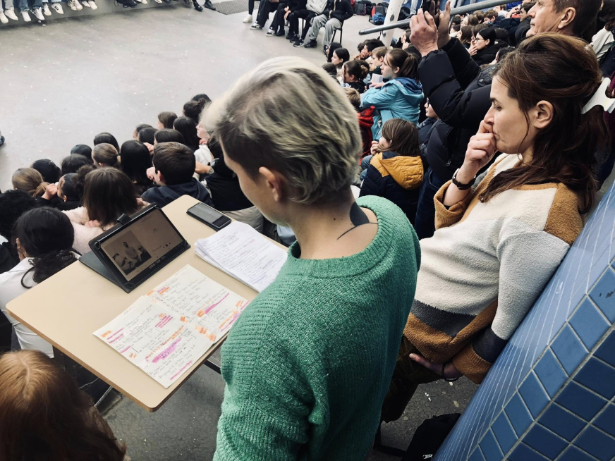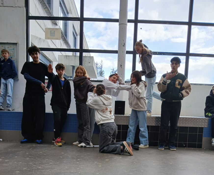 Les semaines du 3 au 14 mars 2025, trois comédiens de Groupe Odyssées (Flora Diguet, Romain Brosseau, Marie Thomas accompagnés du comédien Dylan Genest-Ollé) sont intervenus auprès de toutes les classes de 4e au collège Bourgchevreuil, de la classe ULIS et des élèves d’UPE2A. Les comédiens ont créé une forme théâtrale dans l’établissement lors des deux premiers jours de résidence.